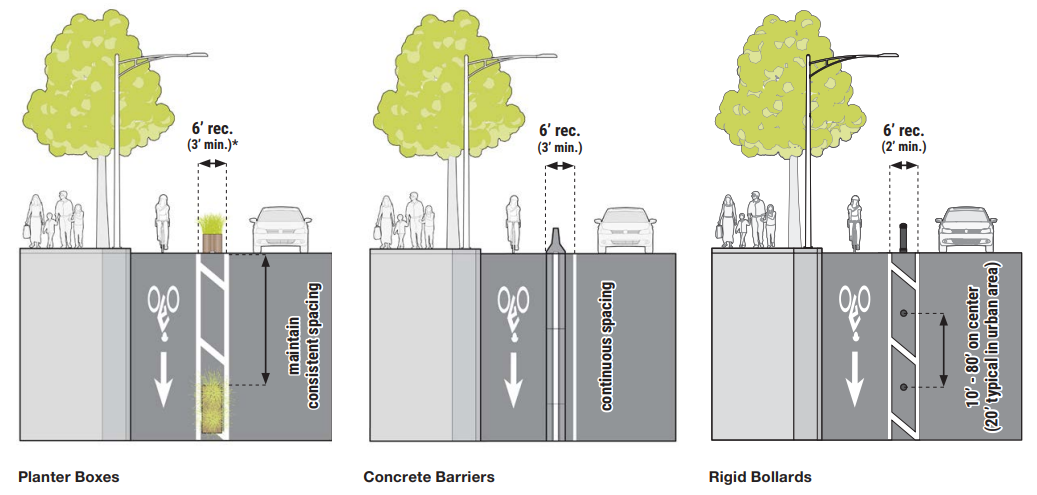 Any type of buffer is associated with increases in self-reported levels of comfort by people cycling, including those who are “interested but concerned,” or individuals who report a willingness to travel by bicycle but express apprehension about traveling near vehicles or in mixed traffic. Bike lanes protected with physical infrastructure such as plastic flex-posts, planters, or raised concrete curbs generated higher levels of comfort than paint-only buffers or buffers created by parked vehicles (McNeil, Monsere, and Dill 2015). Bike lanes with a physical barrier also have a stronger impact on reducing collisions between people biking and people driving compared to paint-only buffered lanes or conventional bike lanes (Schultheiss, et al. 2018).