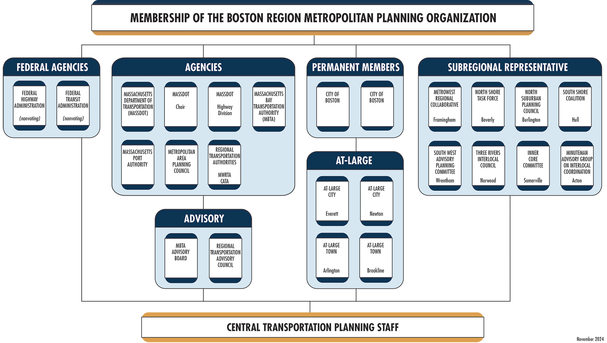 The Boston Region MPO is guided by a 23-member board with representatives of state agencies, regional organizations, and municipalities. Its jurisdiction extends roughly from Boston north to Ipswich, south to Marshfield, and west to municipalities along Interstate 495. Each year, the MPO conducts a process to decide how to spend federal transportation funds for capital projects. The Central Transportation Planning Staff (CTPS), which is the staff to the MPO, manages the TIP development process.
