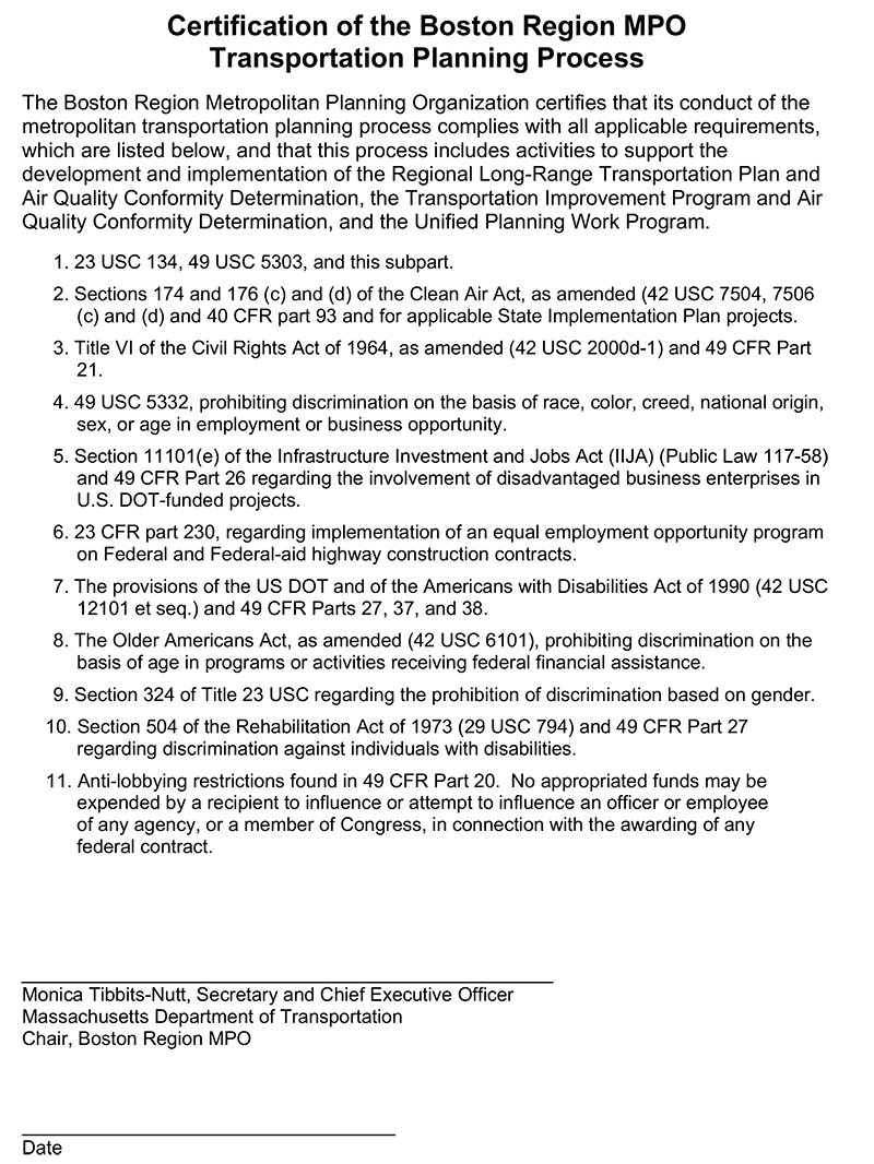 You are invited to participate in our transportation planning process, free from discrimination. The Boston Region Metropolitan Planning Organization (MPO) is committed to nondiscrimination in all activities and complies with Title VI of the Civil Rights Act of 1964, which prohibits discrimination on the basis of race, color, or national origin (including limited English proficiency). Related federal and state nondiscrimination laws prohibit discrimination on the basis of age, sex, disability, and additional protected characteristics.