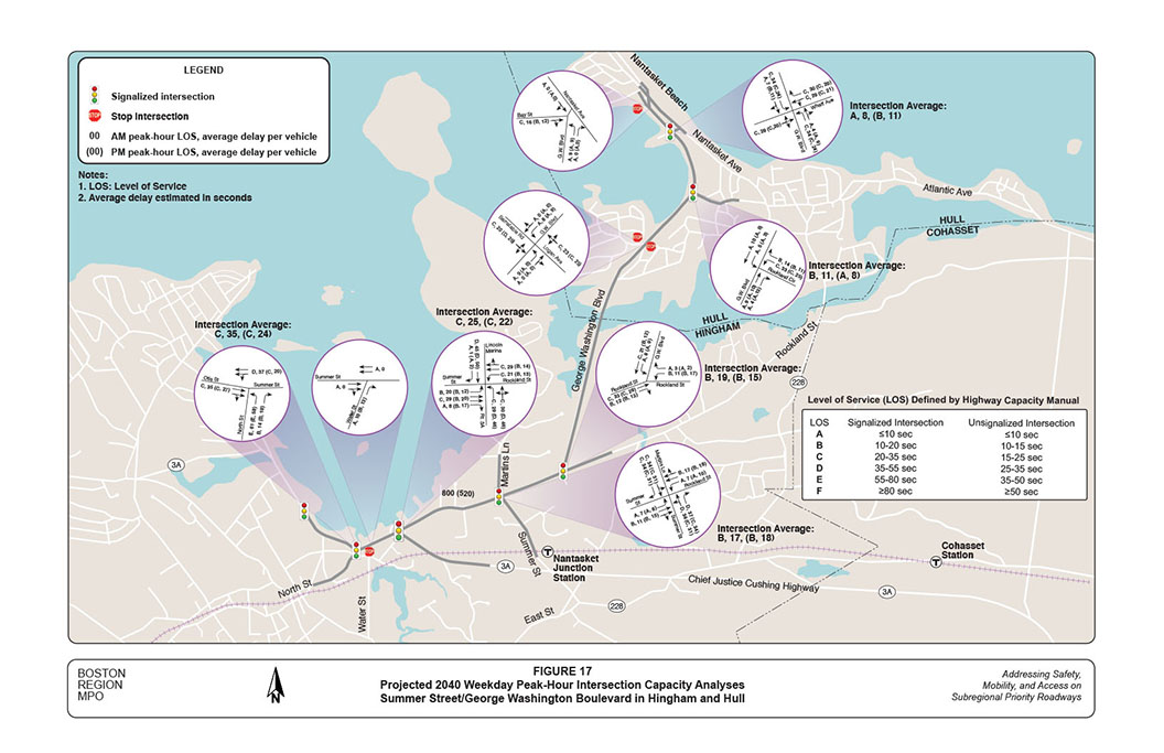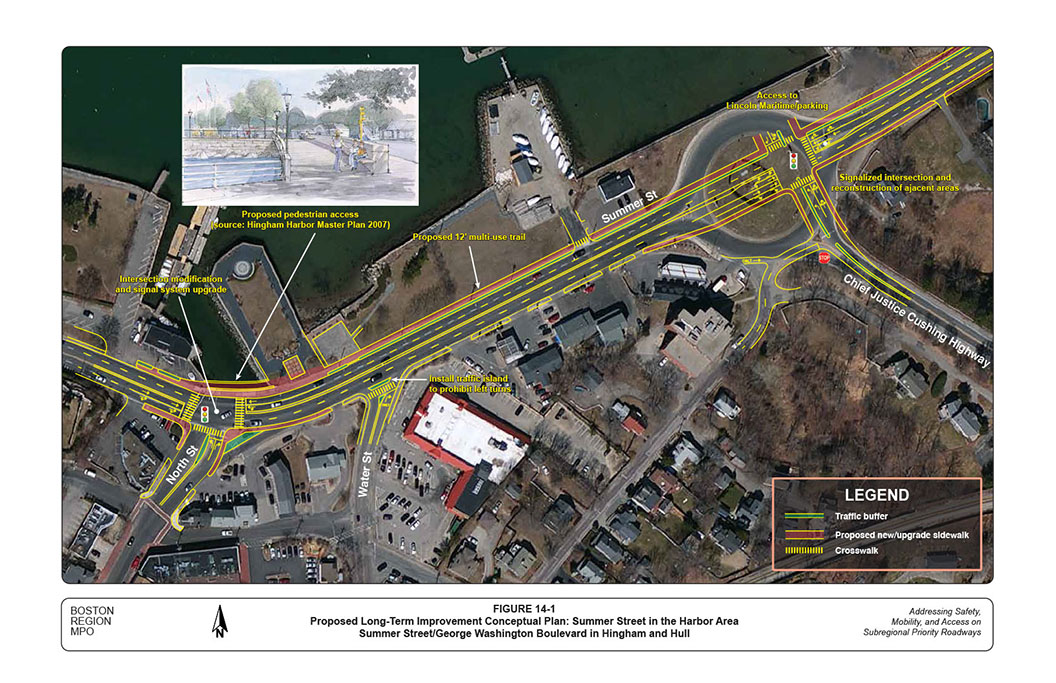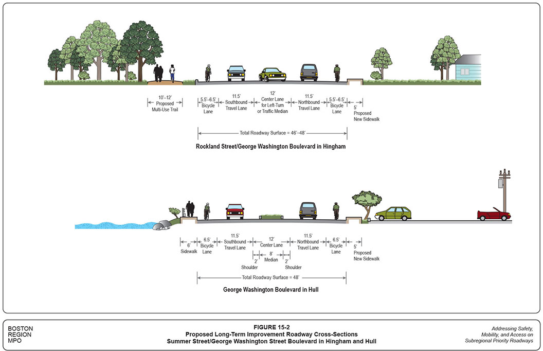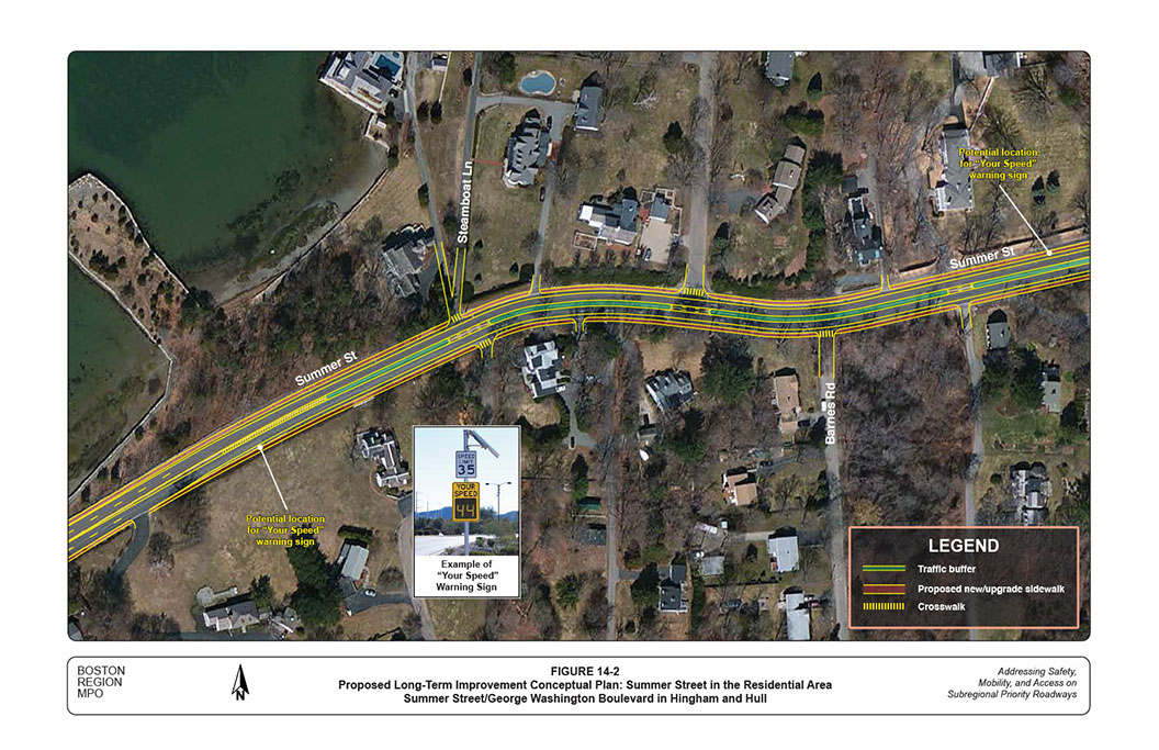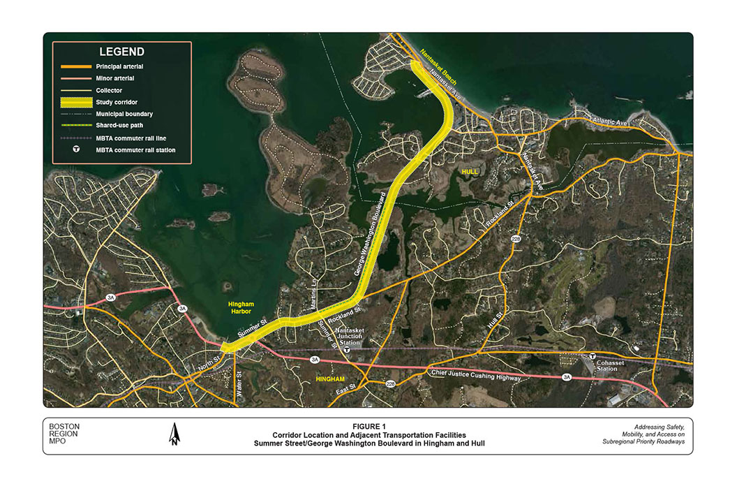 The roadway corridor of Summer Street, Rockland Street, and George Washington Boulevard in Hingham and Hull was selected for analysis in a Boston Region Metropolitan Planning Organization (MPO) funded project for federal fiscal year (FFY) 2015: “Addressing Safety, Mobility, and Access on Subregional Priority Roadways.” The work program for this corridor was approved on October 16, 2014, and the selection was approved on April 2, 2015.