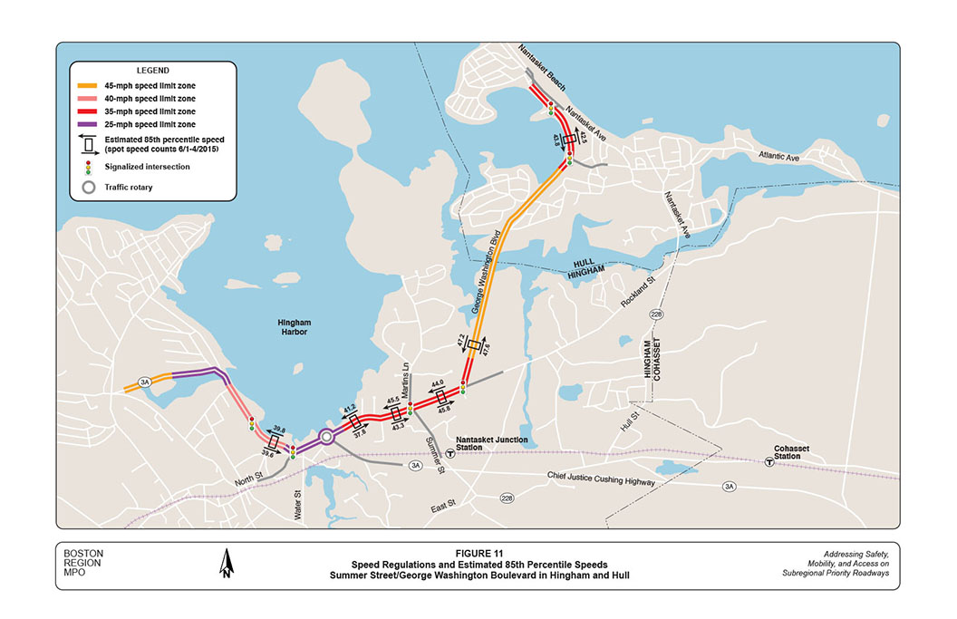 Currently, regulated travel speeds in the corridor are: 40 miles per hour (MPH) in the Bathing Beach area; 25 MPH in Hingham Harbor and the Route 3A rotary; 35 MPH on Summer Street and Rockland Street in the Hingham residential area; 45 MPH on George Washington Boulevard north of Rockland Street until south of Rockland Circle; and 35 MPH on George Washington Boulevard in the Nantasket Beach area from Rockland Circle to Nantasket Avenue.