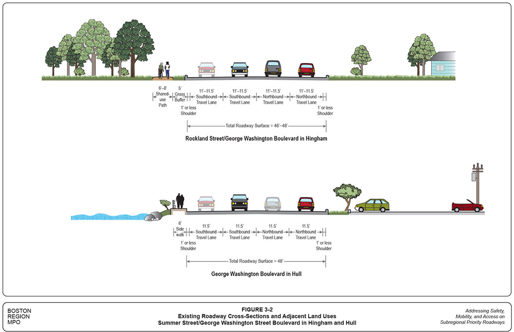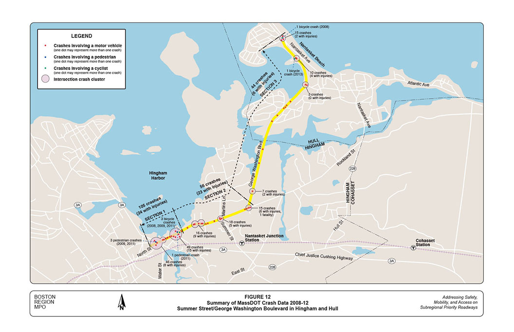 The Summer Street/George Washington Boulevard corridor contains several high-crash and congested locations, such as the Route 3A and North Street intersection, which need to be improved for the safety and mobility of users of all modes. Major portions of the corridor have strong potential for design and implementation toward a Complete Street2 roadway. More importantly, the study site has strong support from all stakeholders, including officers and representatives from Hingham and Hull and the Massachusetts Department of Transportation (MassDOT).