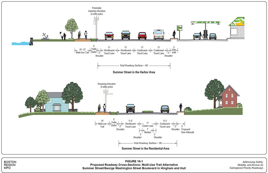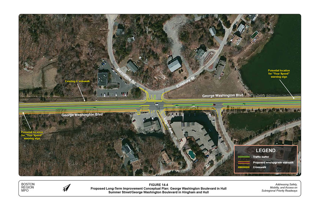 Table 1-4 summarizes the proposed short- and long-term improvements for the section of George Washington Street in Hull. The key proposed short-term improvements include: