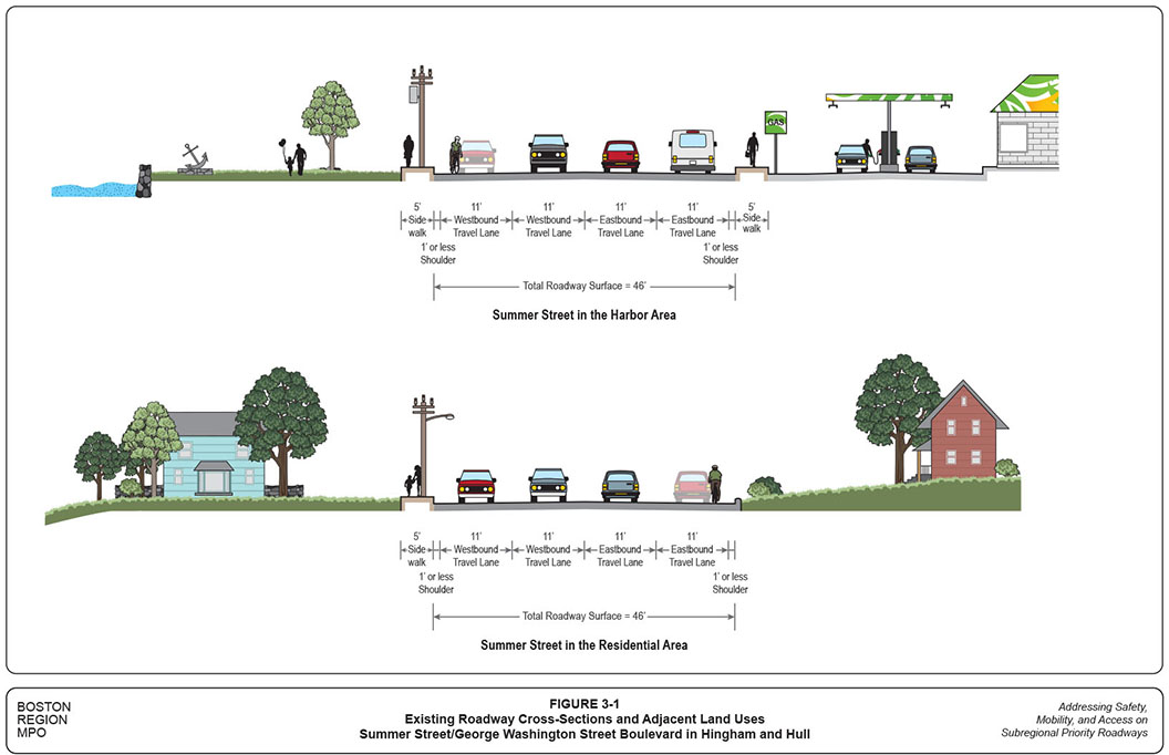 The bottom graphic of Figure 3-1 shows the existing roadway conditions and adjacent land uses on Summer Street in the resident area of Hingham. The similar four-lane roadway layout extends from the harbor area to the residential section, with five-foot sidewalks on only the north side, which frequently are blocked by utility poles. The adjacent land use is predominantly single-family houses on relatively large tracts.