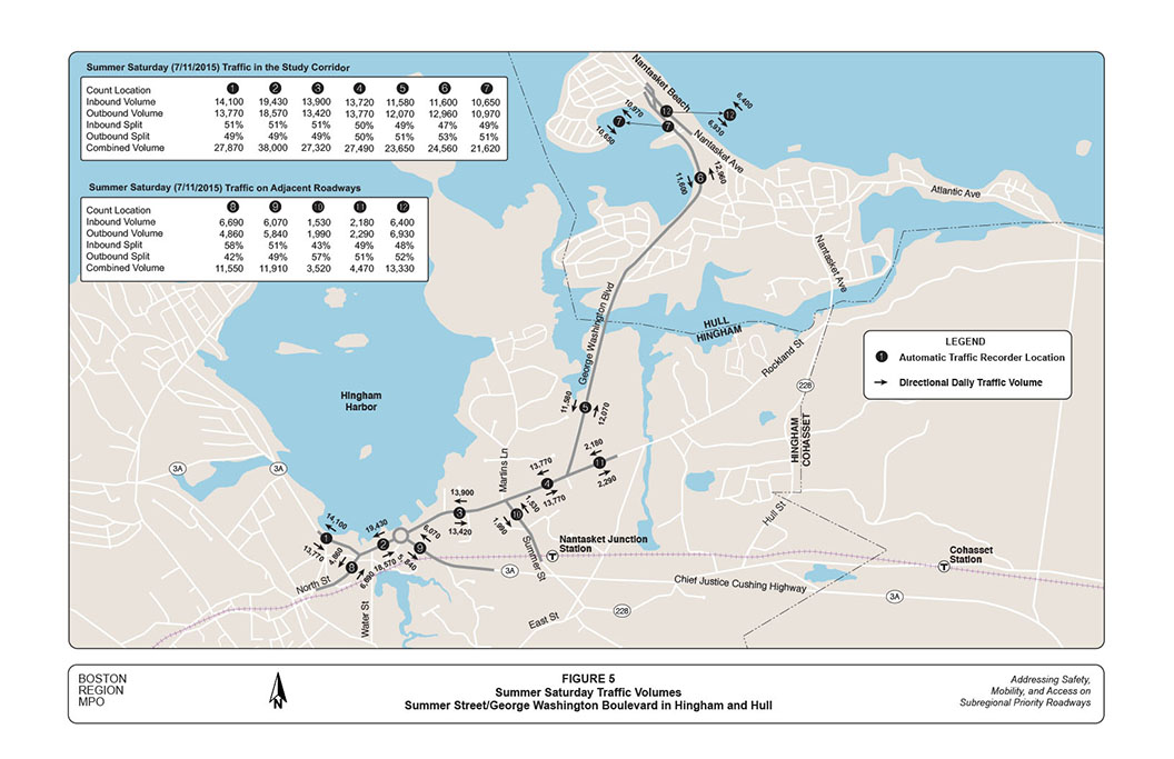 Similar to the weekday counts, the Saturday counts show that the corridor carries evenly split traffic on summer weekend days. Total traffic volumes vary among different locations, ranging from almost 22,000 vehicles per day on George Washington Boulevard near Nantasket Beach to 38,000 vehicles on Summer Street in the Hingham Harbor area. This accounts for an approximate 45-to-85 percent increase from the normal weekday traffic, mainly because of the traffic in and around Nantasket Beach in Hull.