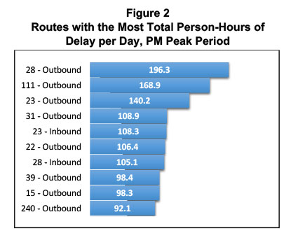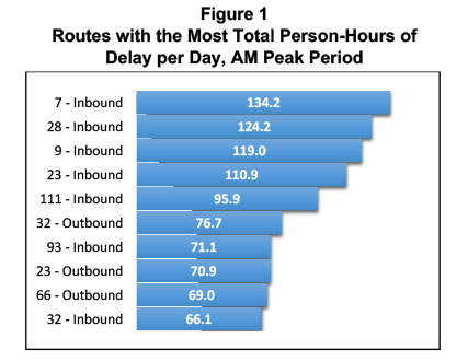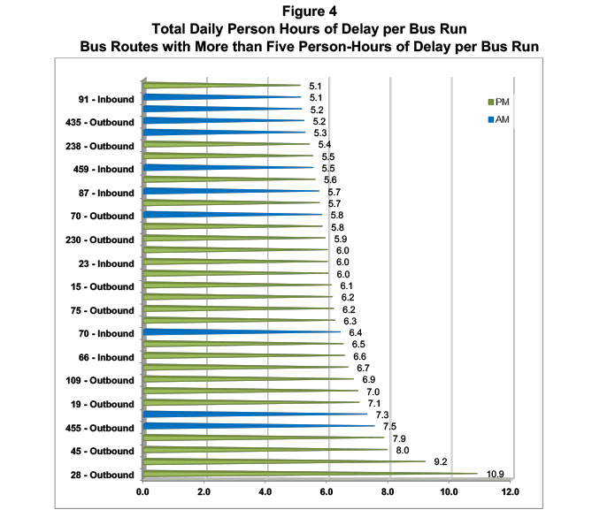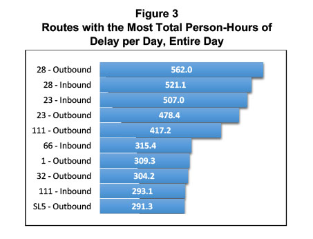 This performance measure shows the average person-hours of delay per trip for each bus route regardless of service frequency. (Use of absolute person-hours of delay per route could overstate the impact to individual passengers on high-frequency routes.)