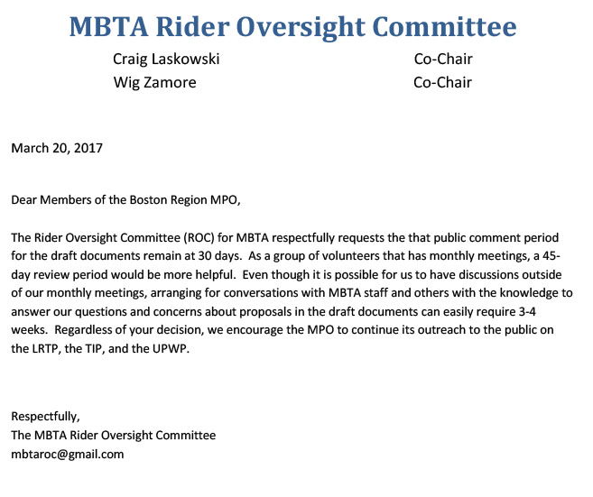 | MBTA Rider Oversight Committee | Maintain the existing 30-day period for all documents. | The Rider Oversight Committee (ROC) for MBTA respectfully requests the that public comment period for the draft documents remain at 30 days. As a group of volunteers that has monthly meetings, a 45-day review period would be more helpful. Even though it is possible for us to have discussions outside of our monthly meetings, arranging for conversations with MBTA staff and others with the knowledge to answer our questions and concerns about proposals in the draft documents can easily require 3-4 weeks. Regardless of your decision, we encourage the MPO to continue its outreach to the public on the LRTP, the TIP, and the UPWP. |