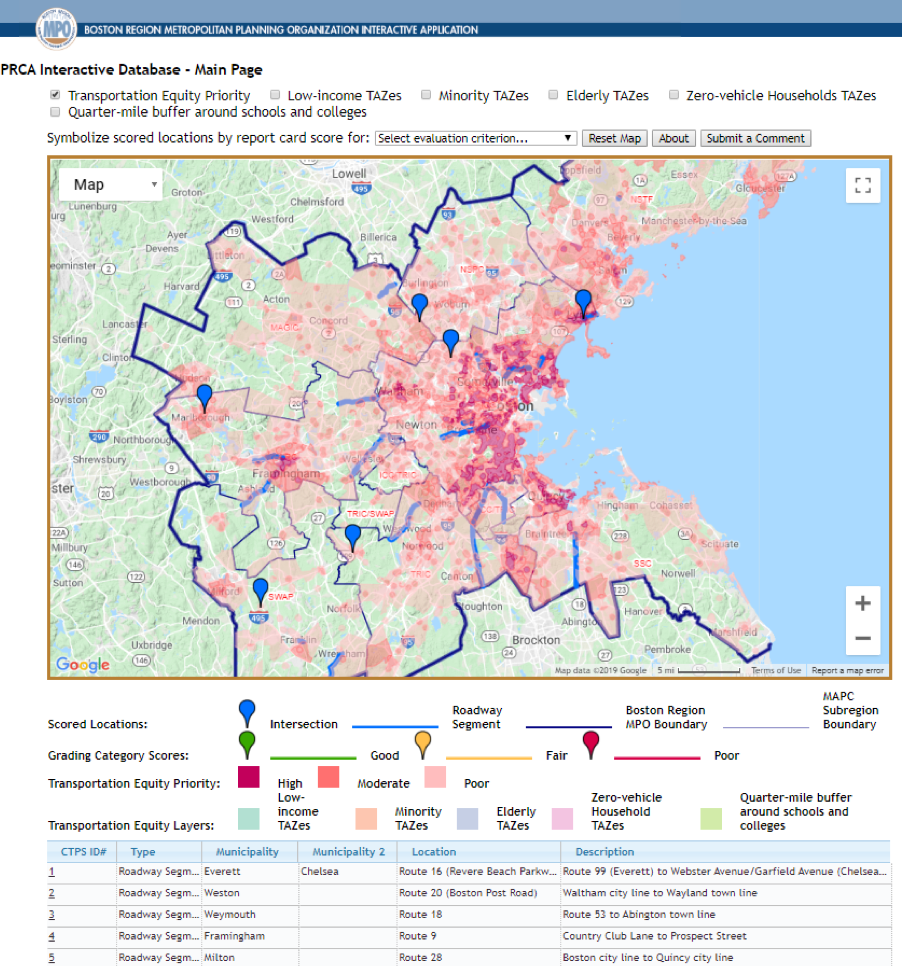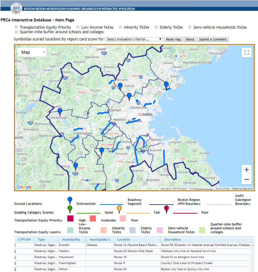 This information is displayed for the Boston region in the PRCA Interactive Database. Intersections are represented as points and roadway segments are shown as line work for the length of roadway studied. Figure 1 shows how basic identifying information about every graded location—such as whether it is a roadway segment or an intersection, the municipality where it is located, the name of the roadway or the intersecting streets, and a description of where a roadway segment begins and ends—is displayed in a table below the interactive map that includes every graded PRCA location in the Boston region.