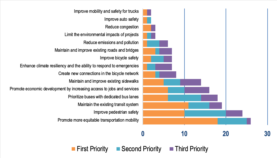 Of 462 respondents, 248 (54 percent) selected “promoting more equitable transportation mobility” as one of their top five priorities, and 50 respondents selected it as their top priority.