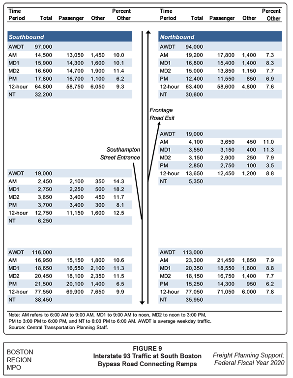 The two parts of I‑93 analyzed in this study, the newer Central Artery and the older Southeast Expressway, together with South Boston Bypass Road, are all appropriately parts of the NHFN. Trucks operate almost everywhere in the road network, but serious problems within the NHFN, such as the Southampton Street bottleneck, merit consideration as freight planning issues.