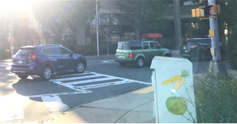 Current intersection geometry at all four corners create wide turning radii, which allow vehicles to take quick turns and make it more difficult to see pedestrians waiting to cross the intersection.