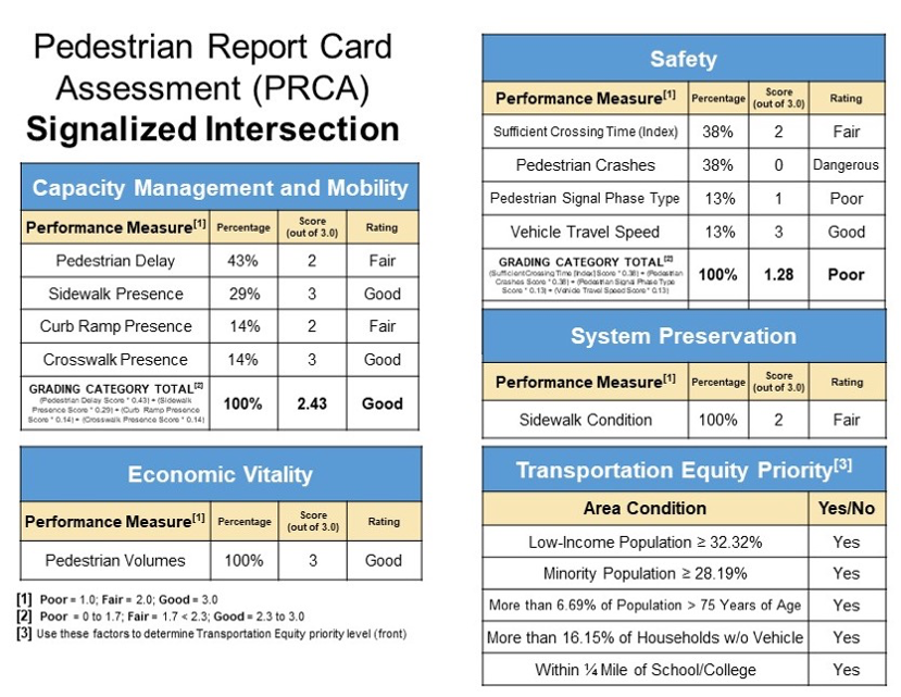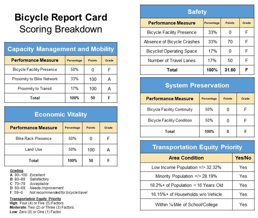 Without bicycle facilities at the location, it was impossible for either roadway to earn points for bicycle System Preservation, which led to another failing grade. Finally, the intersection is considered a High Priority area for pedestrian transportation equity because the proportions of all four populations (low-income, minority, youth, and zero-vehicle households) at the location exceed their regional averages and the intersection is located within one-quarter mile of a school.