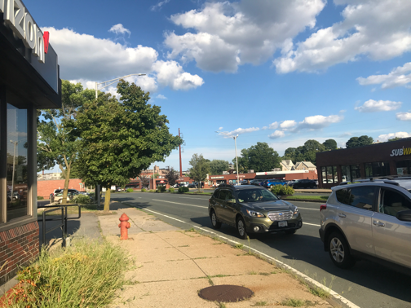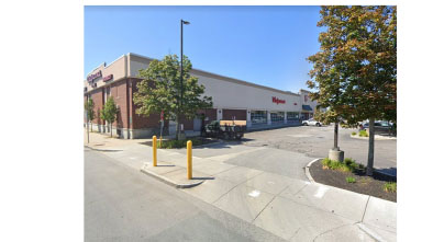 On the northeast corner of the intersection is a Verizon store with a parking lot to its east (Figure 3). The northwest corner of the intersection is anchored by Commerce Place, which includes Cambridge Health Alliance corporate offices, a Bank of America, a Spaulding Outpatient Center, a Massachusetts Department of Education Food Distribution Center, and other businesses (Figure 4). The southwest corner of the intersection has a small area of landscaping that separates the sidewalk from a large parking lot in front of a Walgreens Pharmacy (Figure 5). In the northwest corner of the parking lot is a small, standalone building where Jay’s Pizza and Ice Cream is located.