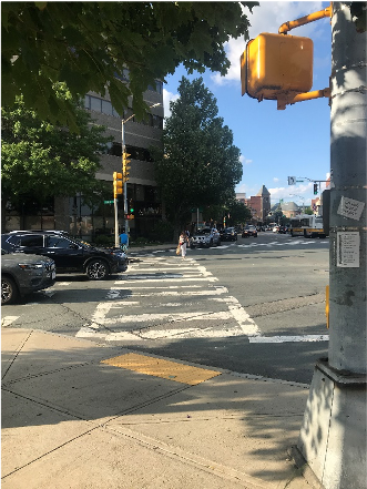 Although there are curb ramps with truncated dome detectable warnings at all four corners of the Centre Street and Main Street intersection, they are all apex ramps, which direct users to travel into the middle of the intersection instead of directly along a crosswalk (Figure 9).
