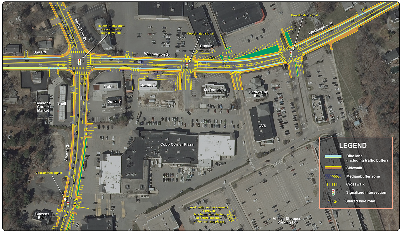 The complicated Cobb Corner district would need further planning and coordination efforts to decide the priorities and phasing scheme. For example, improving the intersection of Washington Street at Route 27 may be considered as a priority location.