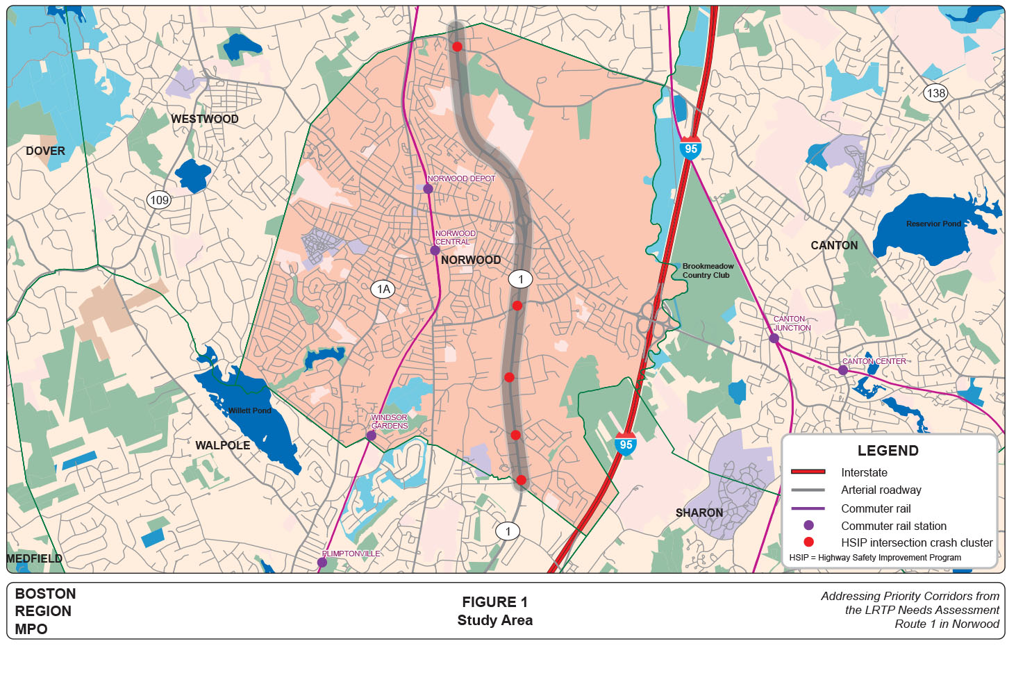 MassDOT Highway District 5 has been fielding inquiries about improving the safety of people walking and biking along the corridor. MAPC has been working with the Neponset Valley Transportation Management Association and communities along the Route 1 corridor from Dedham to Foxborough on addressing job and transit access. They are recommending various transit pilot projects, but the long-term recommendation is to make the Route 1 corridor more friendly for people walking, biking, and taking the bus. Appendix B (attached) includes various letters of support for studying Route 1. MassDOT District 5, MAPC, and The Town of Norwood also support studying Route 1 in Norwood to identify solutions to these problems.