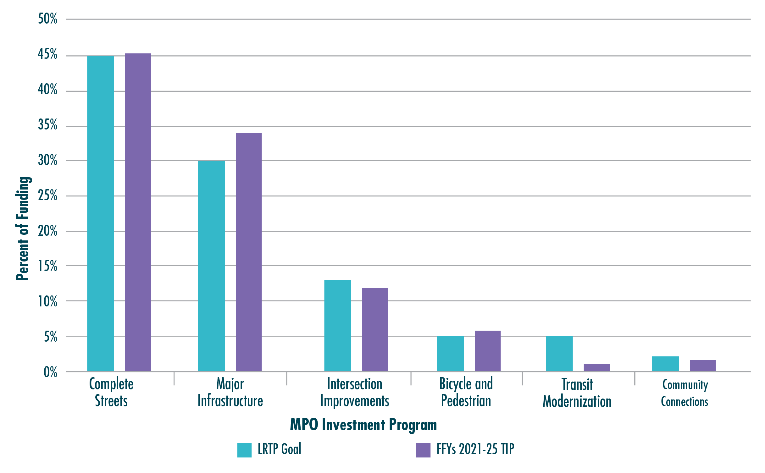 Ao tomar decisões sobre quais projetos financiar, a MPO considera não apenas a distribuição relativa de fundos entre projetos e programas de investimento, mas também como a alocação de fundos para cada programa de investimento se compara às metas de financiamento descritas no Plano de Transporte de Longo Alcance (LRTP) da MPO, o Destination 2040. Os tamanhos dos programas de investimento estabelecidos no LRTP refletem os tipos de projetos que a MPO procura financiar para atingir suas metas e objetivos para a região, desde o aprimoramento da segurança de todos os usuários até a promoção da mobilidade e acessibilidade em toda a região. Mais informações sobre as metas e objetivos da MPO estão disponíveis no Capítulo 1, e uma comparação entre os tamanhos dos programas de investimento do LRTP e os níveis de financiamento do programa nos TIP dos anos fiscais de 2021–25 é mostrada na Figura ES-2 abaixo.