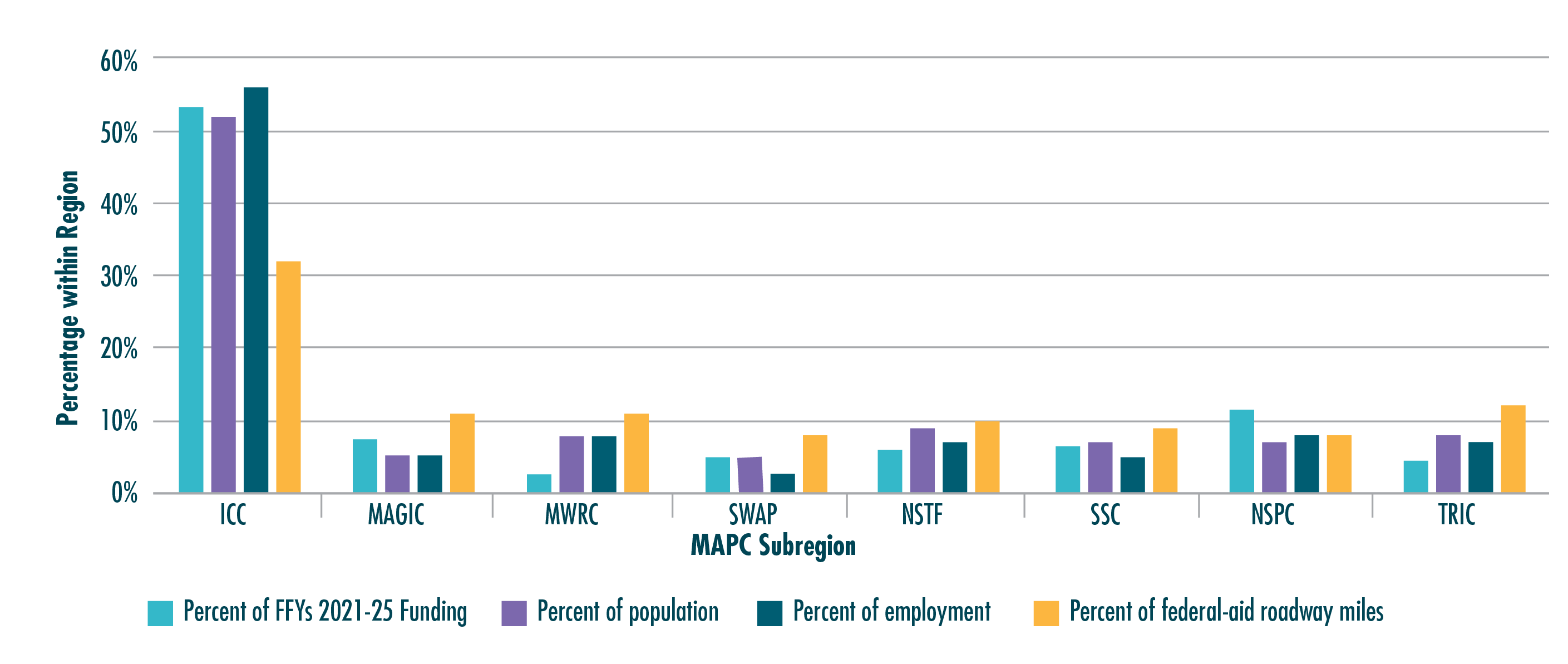 Os investimentos feitos no TIP para os anos fiscais de 2021–25 serão implementados em 38 cidades da região da MPO, variando de densas comunidades centrais até o desenvolvimento de subúrbios mais distantes do centro urbano. A Figura ES-3 ilustra a distribuição do financiamento da Meta Regional entre as oito subregiões dentro da jurisdição da MPO da Região de Boston, conforme definido pelo Conselho de Planejamento da Área Metropolitana (MAPC). Esse número também inclui informações sobre como a distribuição de fundos se compara às principais medidas para medir a necessidade de financiamento por subregião, incluindo a porcentagem de população regional, emprego e milhas rodoviárias da Federal-Aid em cada subregião.