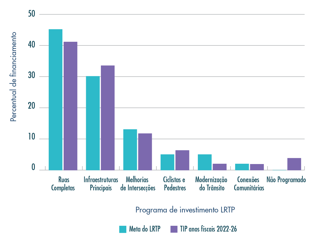 Ao tomar decisões sobre quais projetos financiar, a MPO considera não apenas a distribuição relativa de fundos entre projetos e programas de investimento, mas também como a alocação de fundos para cada programa de investimento se compara às metas de financiamento descritas no Plano de Transporte de Longo Alcance (LRTP) da MPO, o Destination 2040. Os tamanhos dos programas de investimento estabelecidos no LRTP refletem os tipos de projetos que a MPO procura financiar para atingir suas metas e objetivos para a região, desde o aprimoramento da segurança de todos os usuários até a promoção da mobilidade e acessibilidade em toda a região. Mais informações sobre as metas e objetivos da MPO estão disponíveis no Capítulo 1, e uma comparação entre os tamanhos dos programas de investimento do LRTP e os níveis de financiamento do programa nos TIP dos anos fiscais de 2022-26 é mostrada na Figura ES-2.