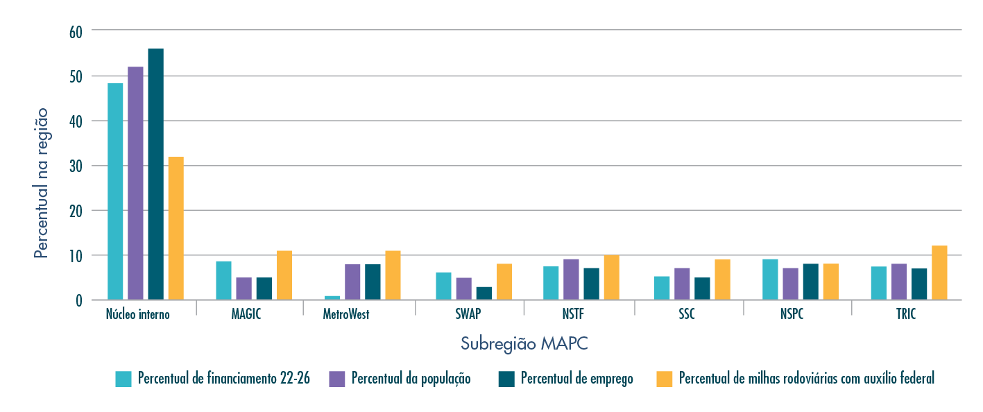 Em Massachusetts, o financiamento do Programa de Assistência Federal para Rodovias é distribuído pelo MassDOT, que aloca fundos para pagamentos de Notas de Antecipação de Concessões (GANs), vários programas estaduais e Metas Regionais para as MPOs do estado. Em 2022-26, os programas de rodovias, pontes, bicicletas e pedestres representam mais de US$ 1,2 bilhão em financiamento para a região de Boston. O financiamento das Metas Regionais fornecido às MPOs pode ser programado para os projetos a critério de cada MPO, enquanto o MassDOT tem o poder de propor projetos para programas estaduais, como os relacionados a reparos de pontes e manutenção de rodovias interestaduais.