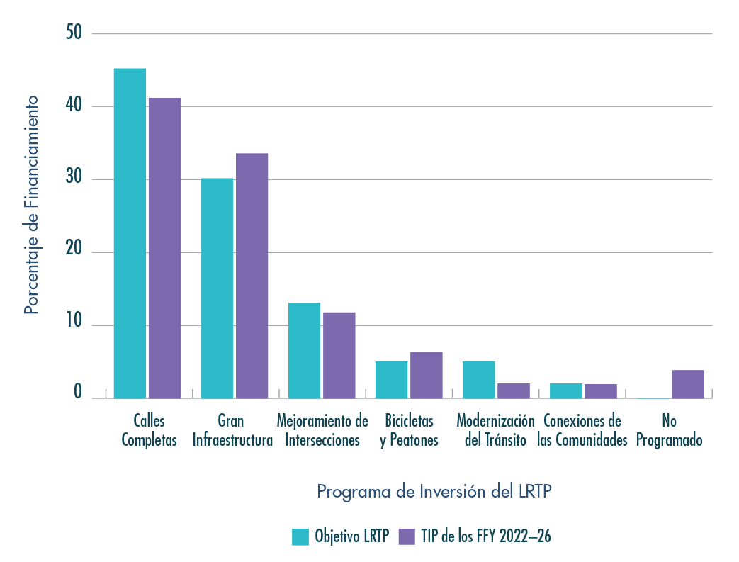 Cuando toma decisiones respecto a cuáles proyectos financiar, la MPO considera no solo la distribución relativa de los fondos en todos los proyectos y programas de inversión, sino también cómo se compara la asignación de fondos a cada programa de inversión con los objetivos de financiamiento descritos en el Plan de Trasporte a Largo Plazo (LRTP, por sus siglas en inglés) de la MPO, Destination 2040. El tamaño de los programas de inversión establecidos en el LRTP refleja los tipos de proyectos que la MPO busca financiar para lograr sus metas y objetivos para la región, desde el mejoramiento de la seguridad para todos los usuarios hasta la promoción de la movilidad y accesibilidad en toda la región. En el Capítulo 1 hay más información sobre las metas y objetivos de la MPO, y en la Figura ES-2 se muestra una comparación entre el tamaño de los programas de inversión del LRTP y los niveles de financiamiento del programa TIP de los FFY 2022-26.