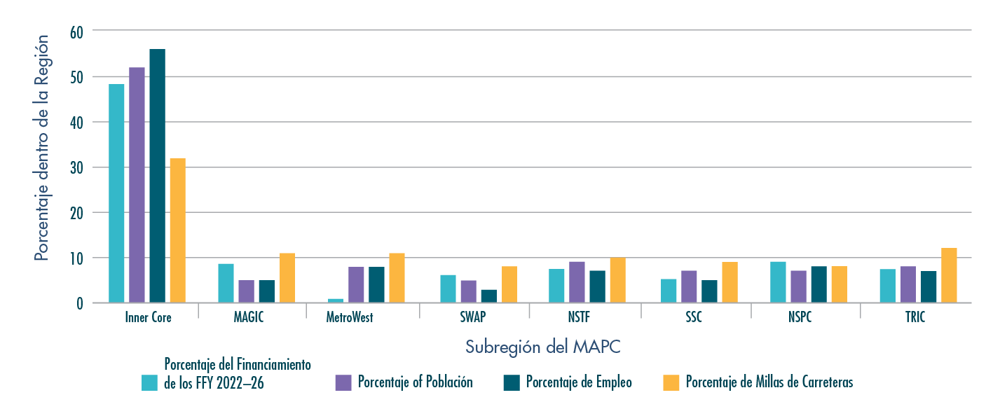 Las inversiones realizadas en el TIP de los FFY 2022-26 se implementarán en 37 ciudades y pueblos de toda la región de Boston, que van desde densas comunidades del centro hasta suburbios en desarrollo más alejados del centro urbano. La Figura ES-3 ilustra la distribución del financiamiento del Objetivo Regional entre las ocho subregiones dentro de la jurisdicción de la MPO de la región de Boston, según las define el Consejo de Planificación del Área Metropolitana (MAPC, por sus siglas en inglés). Esta figura también incluye información respecto a cómo se compara la distribución de los fondos con la métrica clave para la cuantificación de la necesidad de financiamiento por subregión, incluyendo el porcentaje de población regional, el empleo y las millas de carreteras federales dentro de cada subregión.