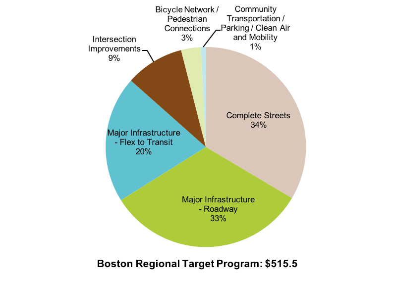 Cada MPO pode decidir como priorizar o seu financiamento da Meta Regional. Dado que o financiamento da Meta Regional é um subconjunto do Programa Rodoviário, a MPO normalmente se programa para projetos rodoviários; no entanto, a MPO flexionou parte de seu financiamento rodoviário do Programa de Trânsito para projetos de expansão de trânsito. O Programa Rodoviário do TIP detalha os projetos que receberão financiamento da Meta Regional da MPO da Região de Boston, bem como os projetos de infraestrutura em todo o estado dentro da região de Boston.