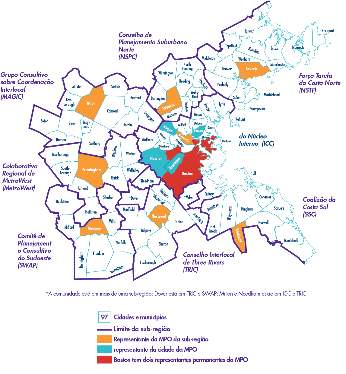A área de planejamento da MPO da Região de Boston se estende por 97 cidades e municípios, desde o norte de Boston até Ipswich, ao sul até Marshfield e a oeste até a Interstate 495.