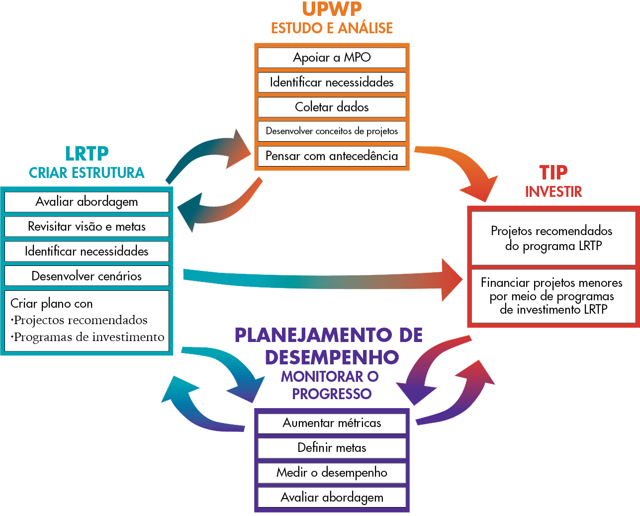 A MPO está atualmente no processo de desenvolvimento de seu próximo LRTP. Além do LRTP e do UPWP, a MPO também produz o TIP para a região de Boston. Sendo o plano de investimento de capital de curto prazo da MPO, o TIP descreve e prioriza projetos de construção de transporte que devem ser implementados durante o próximo período de cinco anos. A Figura ES-3 ilustra a relação entre a visão e os objetivos do LRTP; a base de planejamento para o trabalho da MPO, o UPWP; o TIP; e o processo de monitoramento e avaliação do progresso para alcançar as metas da região.