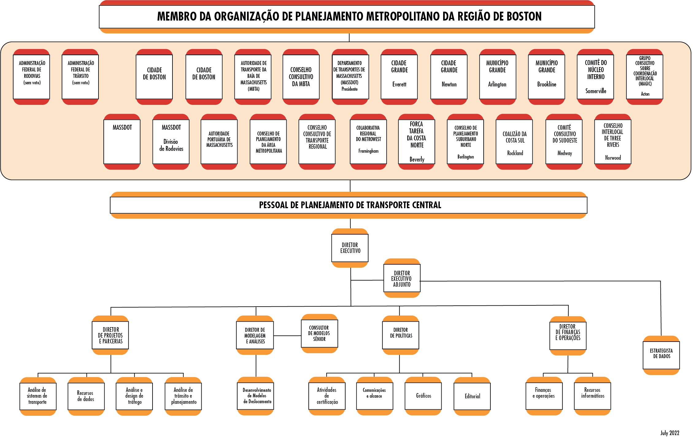 A Figura ES-2 mostra a associação da MPO e a organização da Equipe de Planejamento Central de Transporte (CTPS), que serve como uma equipe para a MPO.