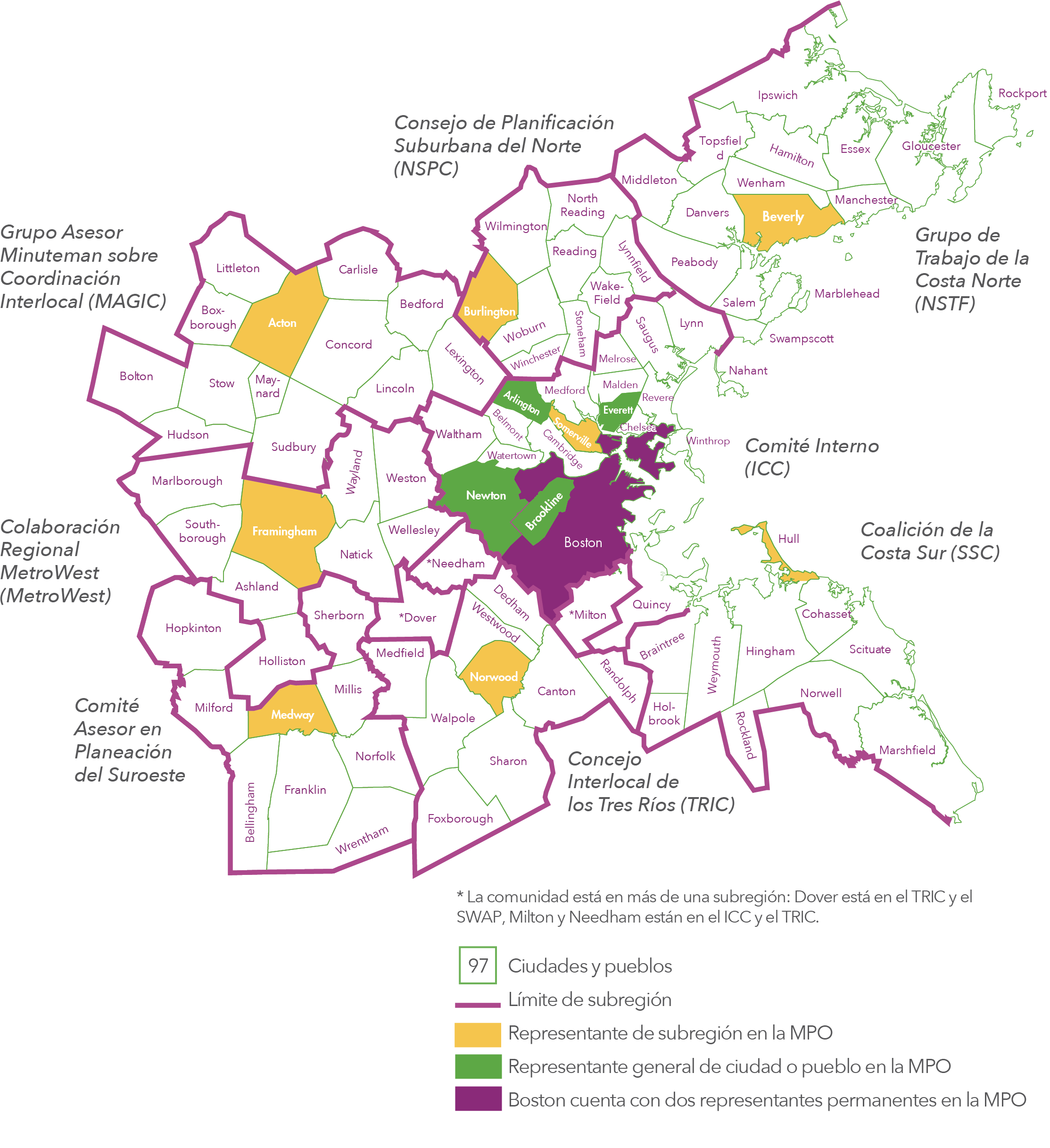 El área de planificación de la MPO de la región de Boston se extiende a través de 97 ciudades y centros urbanos desde Boston al norte hasta Ipswich, al sur hasta Marshfield y al oeste hasta la Interestatal 495.