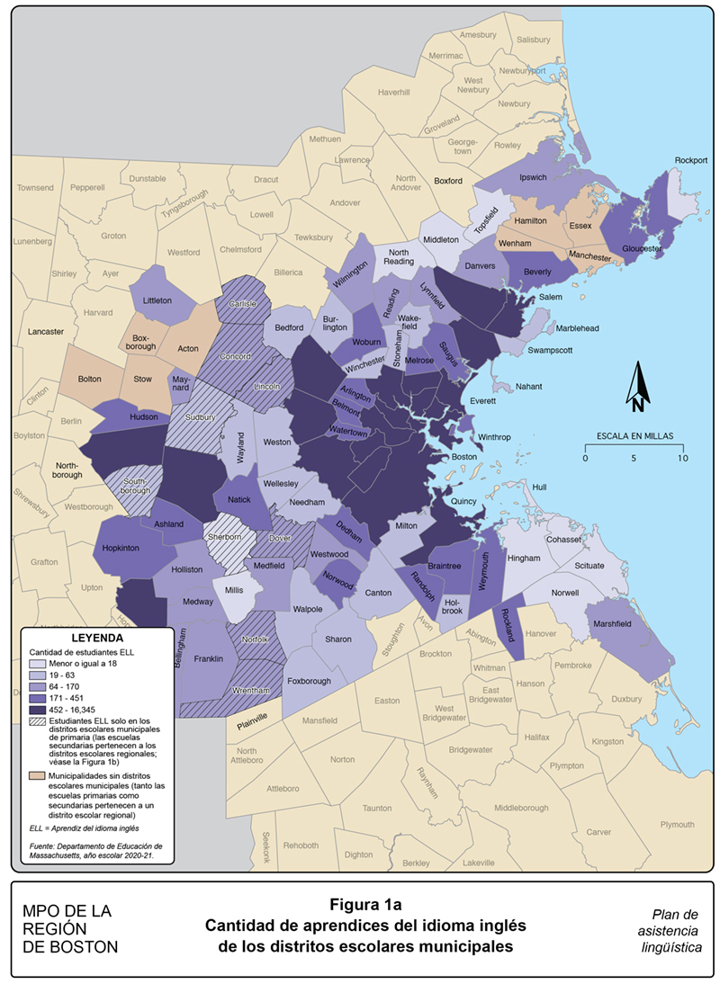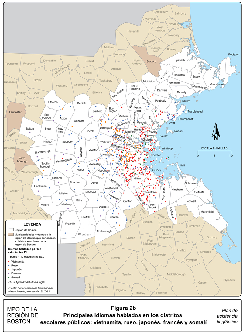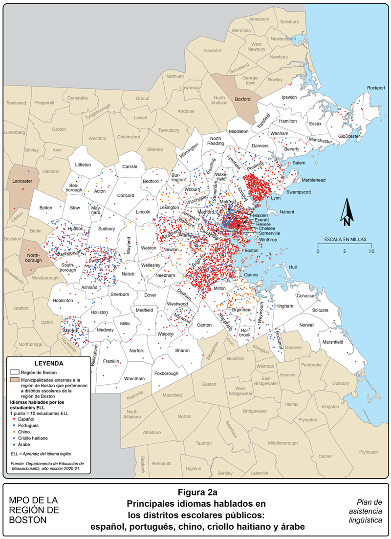 Para obtener mayor información sobre en qué parte de la región de Boston se hablan estos idiomas, el personal analizó la información de los idiomas para los distritos escolares públicos municipales y regionales. El Departamento de Educación de Massachusetts (MDOE, por sus siglas en inglés) recopila información sobre la cantidad de aprendices del idioma inglés (ELL, por sus siglas en inglés) y los idiomas que estos hablan. El español (52.6 por ciento), portugués (18.3 por ciento), chino (5.9 por ciento), criollo haitiano (5.0 por ciento), y árabe (2.9 por ciento) son los cinco idiomas hablados más ampliamente por los ELL. Esta información más detallada también permite al personal de la MPO observar en cuáles municipalidades se habla cada idioma, lo cual ayuda en la divulgación al público.