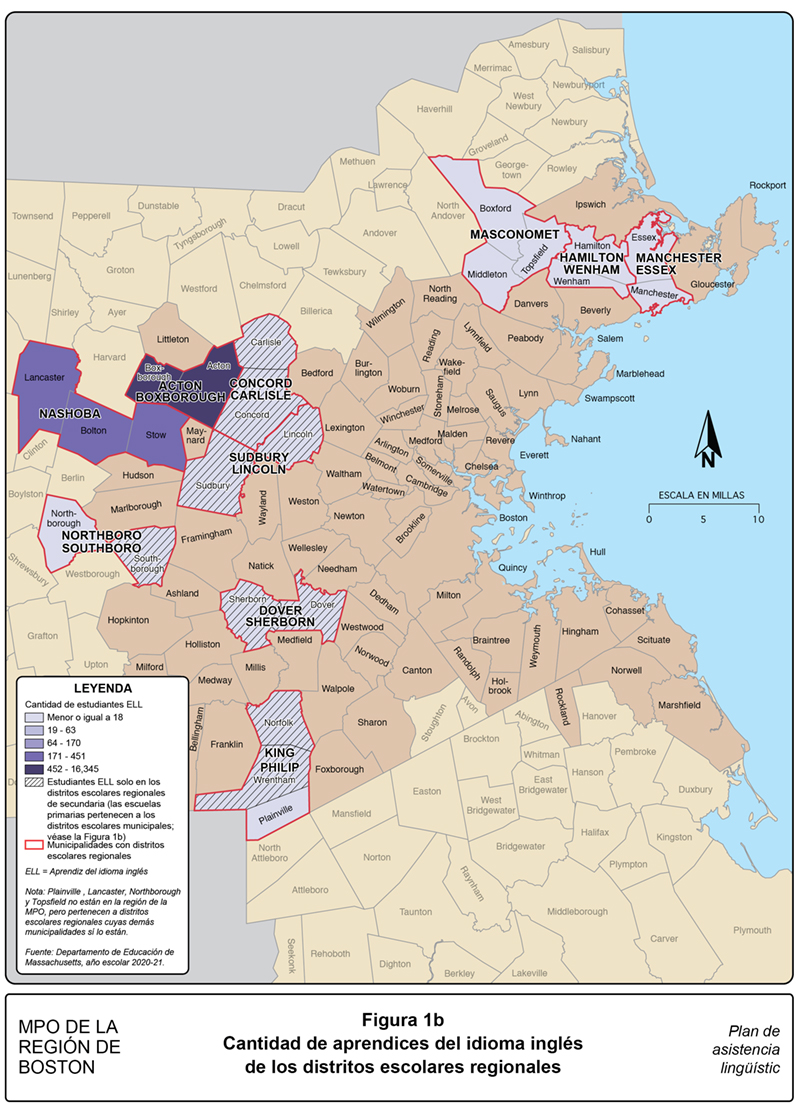En vista de los cambios en la manera de reportar la información lingüística en las tablas resumen de la ACS y a la distribución geográfica usada en la información de la PUMS, el personal de la MPO buscó otras fuentes de datos de los idiomas hablados por las personas con LEP que están disponibles en ubicaciones geográficas más pequeñas. Algunas agencias estatales de Massachusetts proporcionan información lingüística sobre las personas a las que brindan servicio, incluso el Departamento de Educación de Massachusetts (MDOE). El personal de la MPO revisó los distritos escolares públicos (distritos escolares municipales y regionales) de la región de Boston. El MDOE recopila información de la cantidad de estudiantes que son aprendices del idioma inglés (ELL) en cada distrito escolar, así como también los idiomas que estos hablan. Puede asumirse que si un estudiante es un ELL; es probable que sus padres tengan un conocimiento limitado del idioma inglés. Aun cuando estos datos no se correlacionan de manera perfecta con la definición de LEP del USDOT, le permiten al personal identificar donde están presentes las necesidades lingüísticas en las ubicaciones geográficas más pequeñas, lo cual es especialmente útil cuando el personal lleva a cabo la divulgación al público en las comunidades de la región de Boston. De conformidad con la información del año escolar 2020-21, 11.8 por ciento de los estudiantes de la escuela primaria y secundaria de los distritos públicos de la región de Boston, de un total de 413,881 estudiantes, eran ELL. Esa cantidad es muy cercana al 11.1 por ciento de personas con LEP de la región reportado por la información de la PUMS.