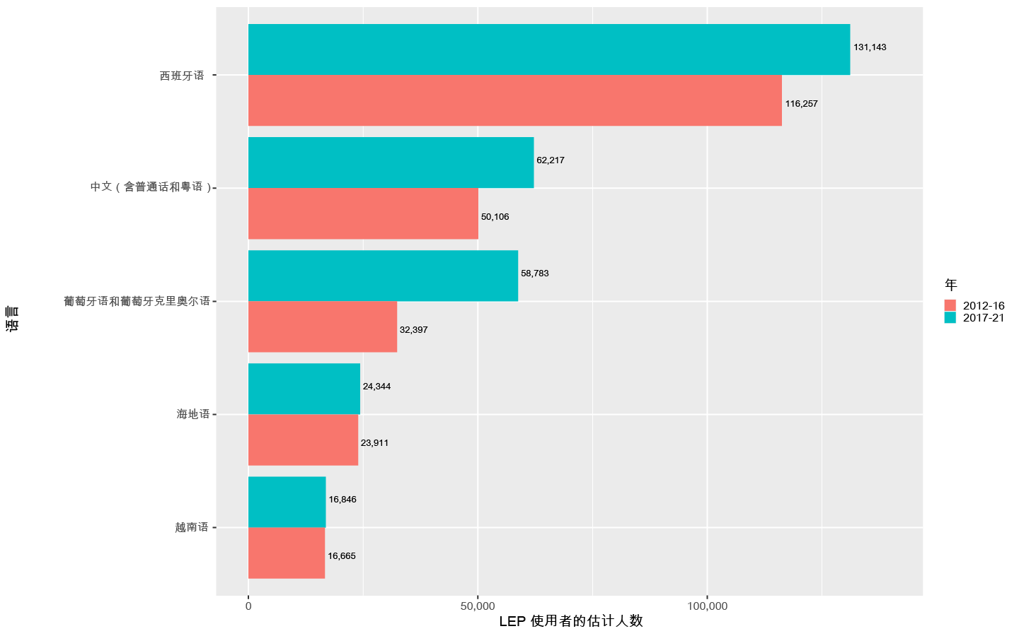 自 2012-16 年 ACS 以来,葡语人口增幅最大,从大约 3.2 万增长到 5.8 万,增长了 81.4%。其他增幅较大的语言包括中文、印地语、孟加拉语、泰卢固语和波斯语。下降幅度最大的语言包括意大利语、阿拉伯语、日语、波兰语和俄语。