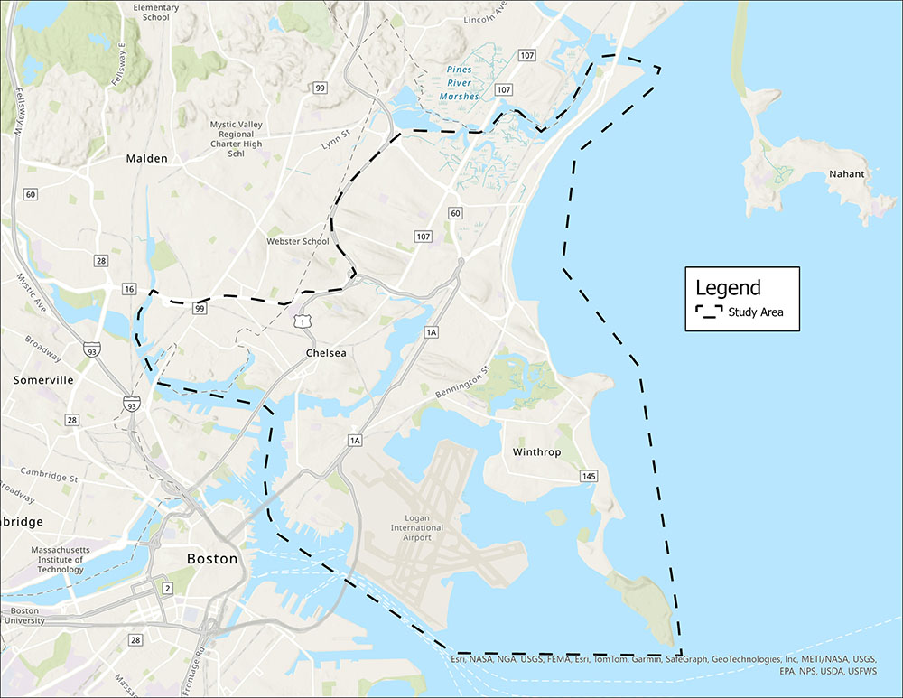 The study area, seen in Figure 1, contains northern Suffolk County and a small part of southern Middlesex County, including portions of Chelsea, Everett, Revere, East Boston, and Winthrop. The study area sits at an important and complex intersection of disadvantaged communities and long-standing industry and related infrastructure, all of which face various challenges related to climate change.2
