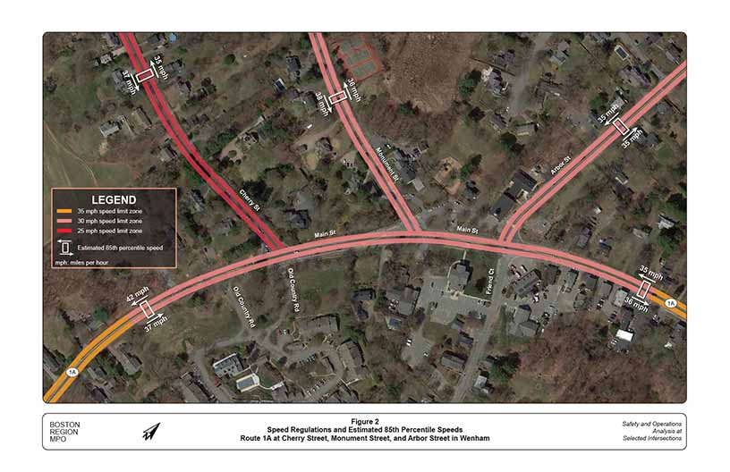 The study area (shown in Figure 1) is located in the center of the Town of Wenham and covers a quarter-mile segment of Route 1A. Route 1A intersects three streets within this distance: Cherry Street and Monument Street, which approach from the west and end at T intersections, and Arbor Street, which approaches from the north and forms a four-way intersection with the much smaller Friend Court. All three of these intersections are unsignalized.